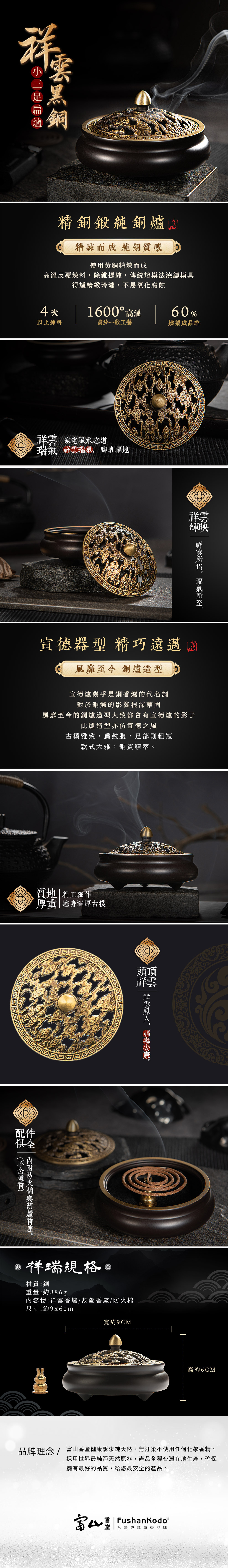 祥雲黑銅小三足扁爐 香粉/盤香兩用香爐 / 1個