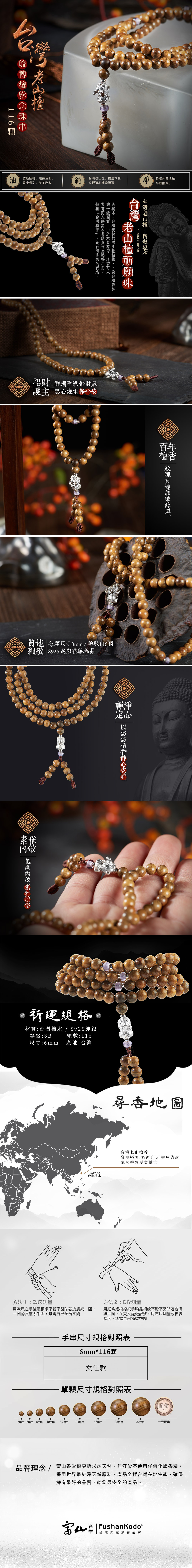 富山香堂 紫金琉轉貔貅手珠 台灣肖楠木 開運念珠 925純銀飾 日本琉璃 6mm 116顆